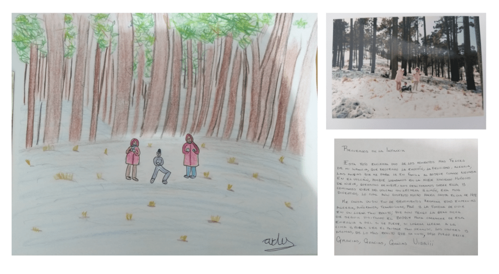 Esta foto encierra uno de los momentos más felices de mi infancia, que recuerdo la emoción, la felicidad, alegría, las ansias que me daba ir en familia al bosque cuando nevaba en el volcán, porque jugábamos en la nieve haciendo muñecos de nieve, guerrillas de nieve, nos deslizábamos sobre ella y comíamos nieve del volcán con lechera y limón, era muy divertido, lo cual aún disfruto mucho hacer hasta el día de hoy.