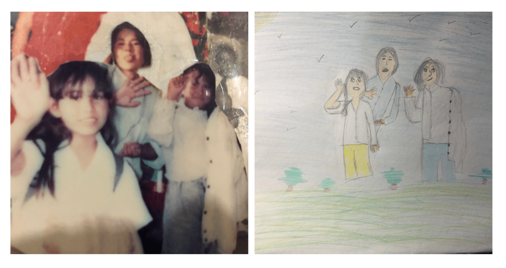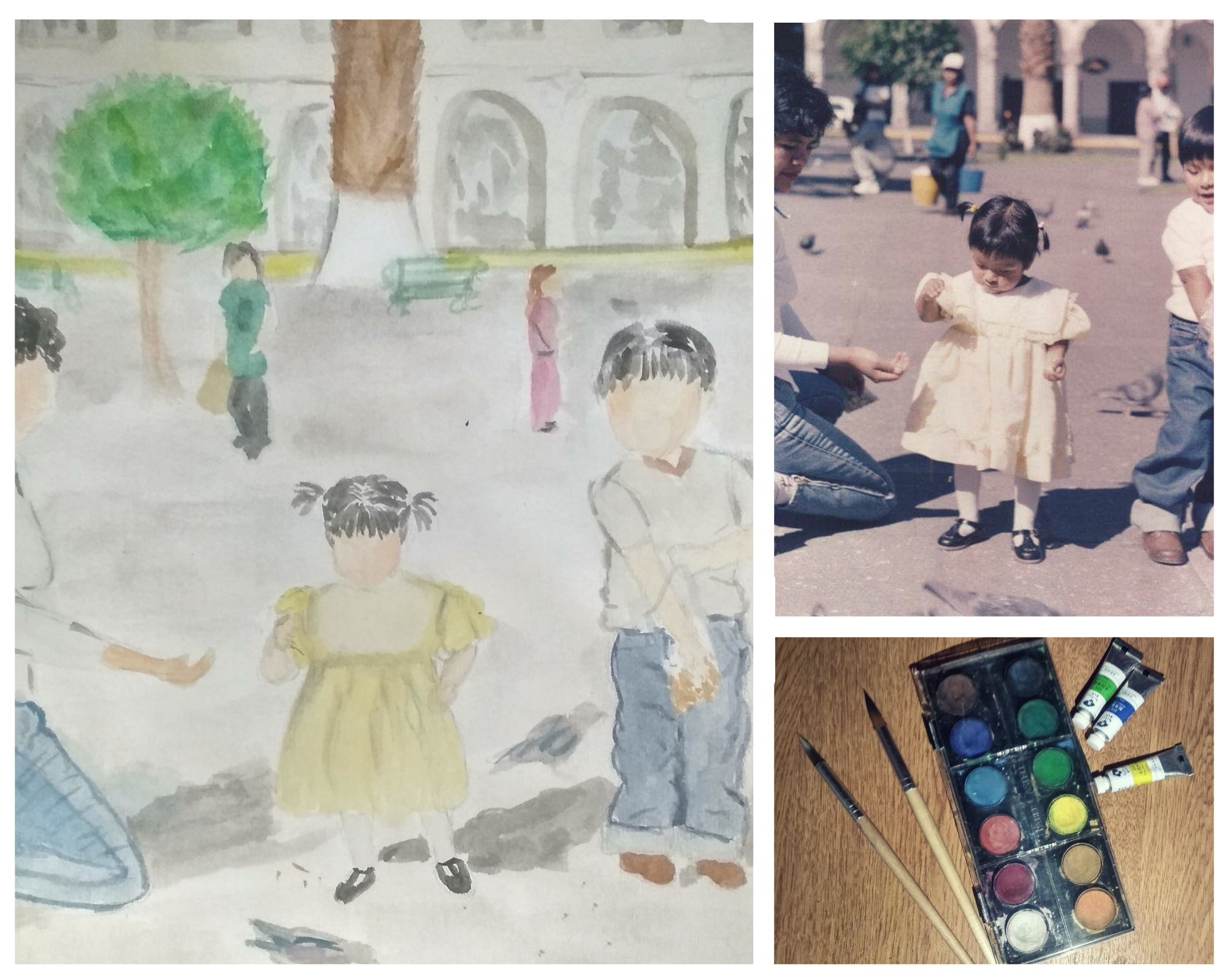 La tarea consistió en buscar fotografías de nuestra infancia para luego convertirlas en pinturas o dibujos mientras manteníamos nuestra atención en las emociones y sentimientos que este ejercicio nos provoca.
