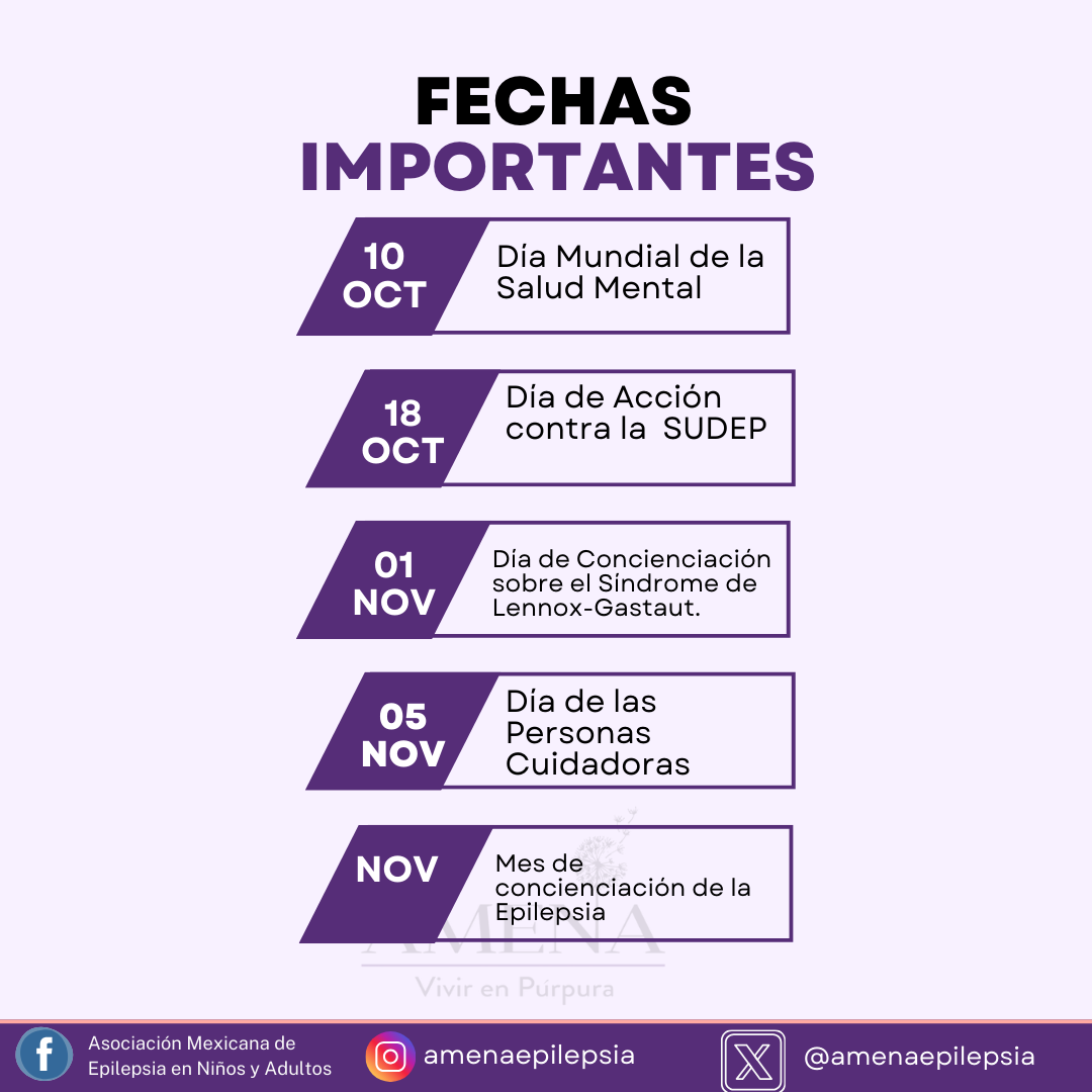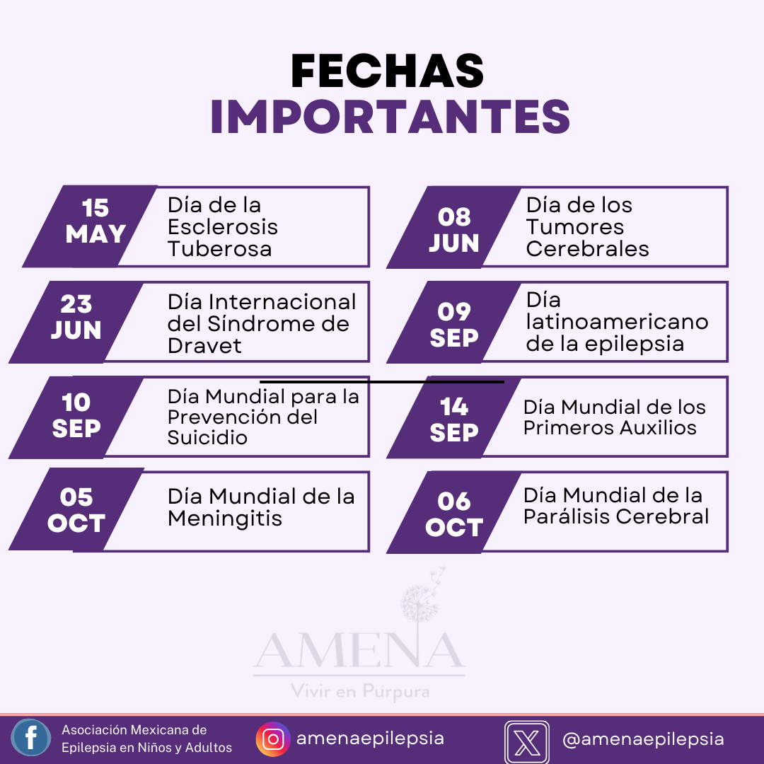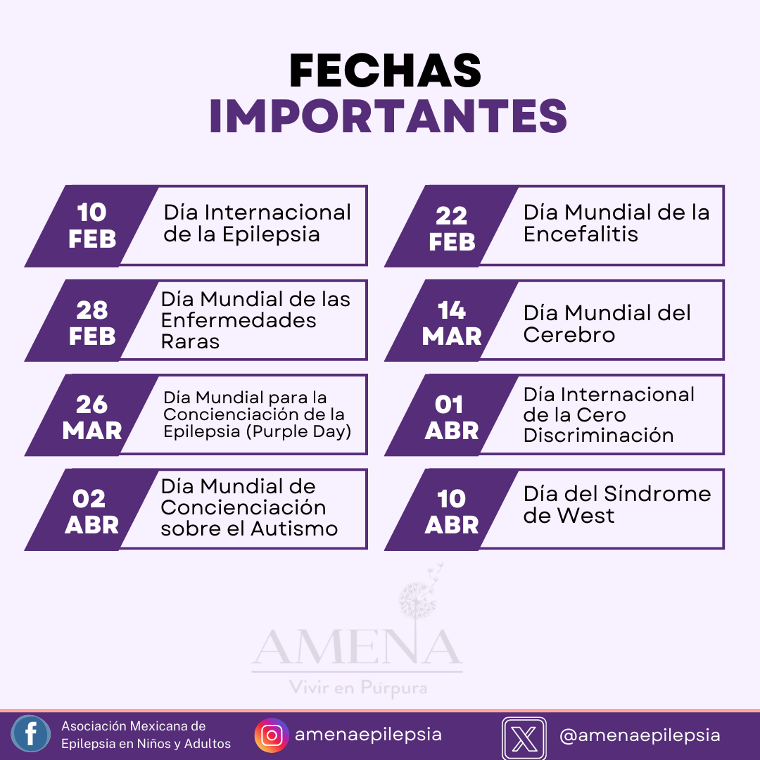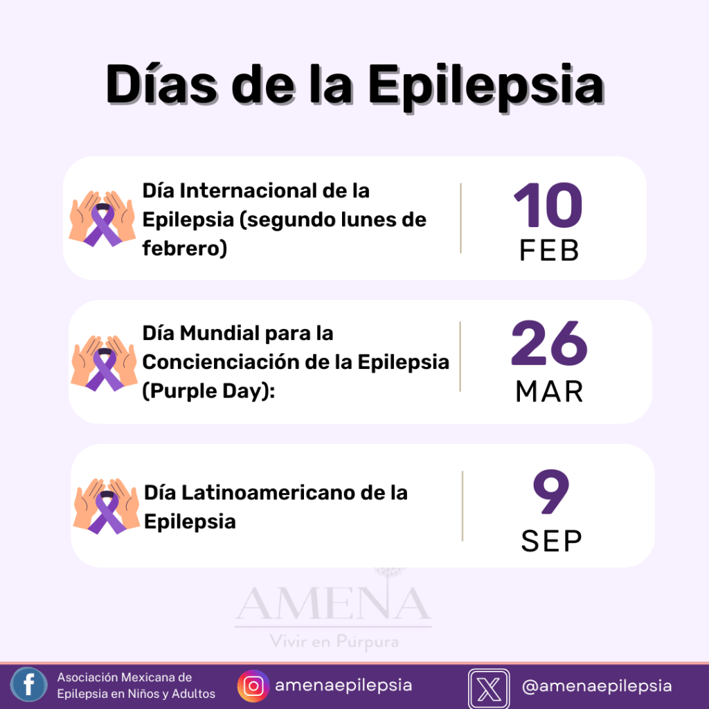 - 26 de marzo: Día Mundial de la Epilepsia (Purple Day) 💜 Este día busca aumentar la conciencia a nivel global, alentando a las personas a vestir de color púrpura en apoyo y solidaridad a las personas con epilepsia.