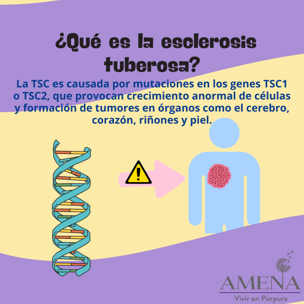 TSC es provocado por mutaciones en los genes TSC1 (ubicado en el cromosoma 9) o TSC2 (en el cromosoma 16), los cuales codifican las proteínas hamartina y tuberina, respectivamente. Estas proteínas (hamartina y tuberina) trabajan juntas para frenar la actividad del complejo mTORC1, que es una señal que controla el crecimiento de las células. Cuando estas proteínas no funcionan bien, el complejo mTORC1 se activa demasiado, haciendo que las células crezcan sin control y formando tumores benignos (no cancerosos) en diferentes órganos.