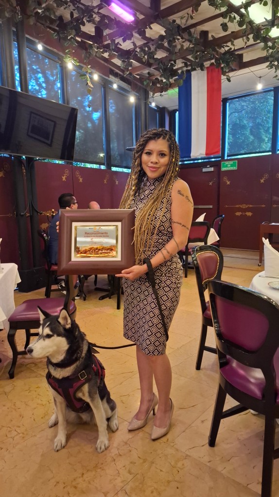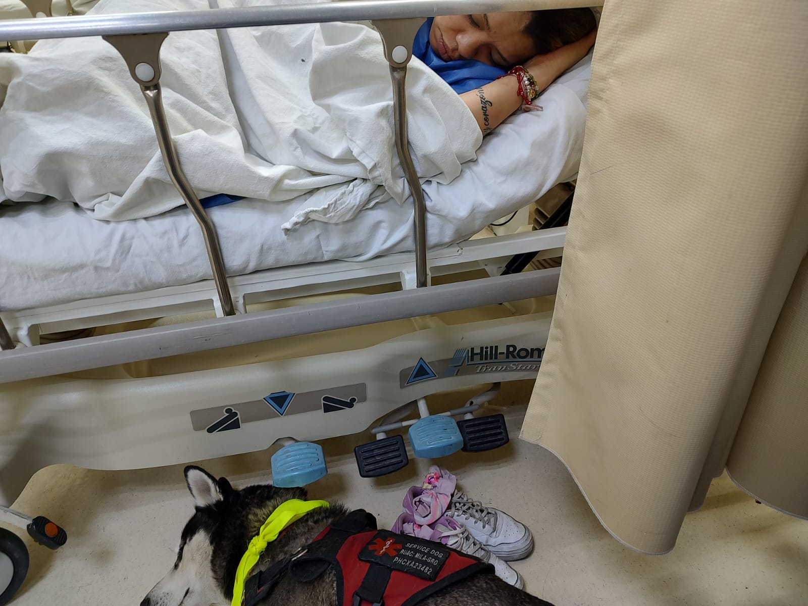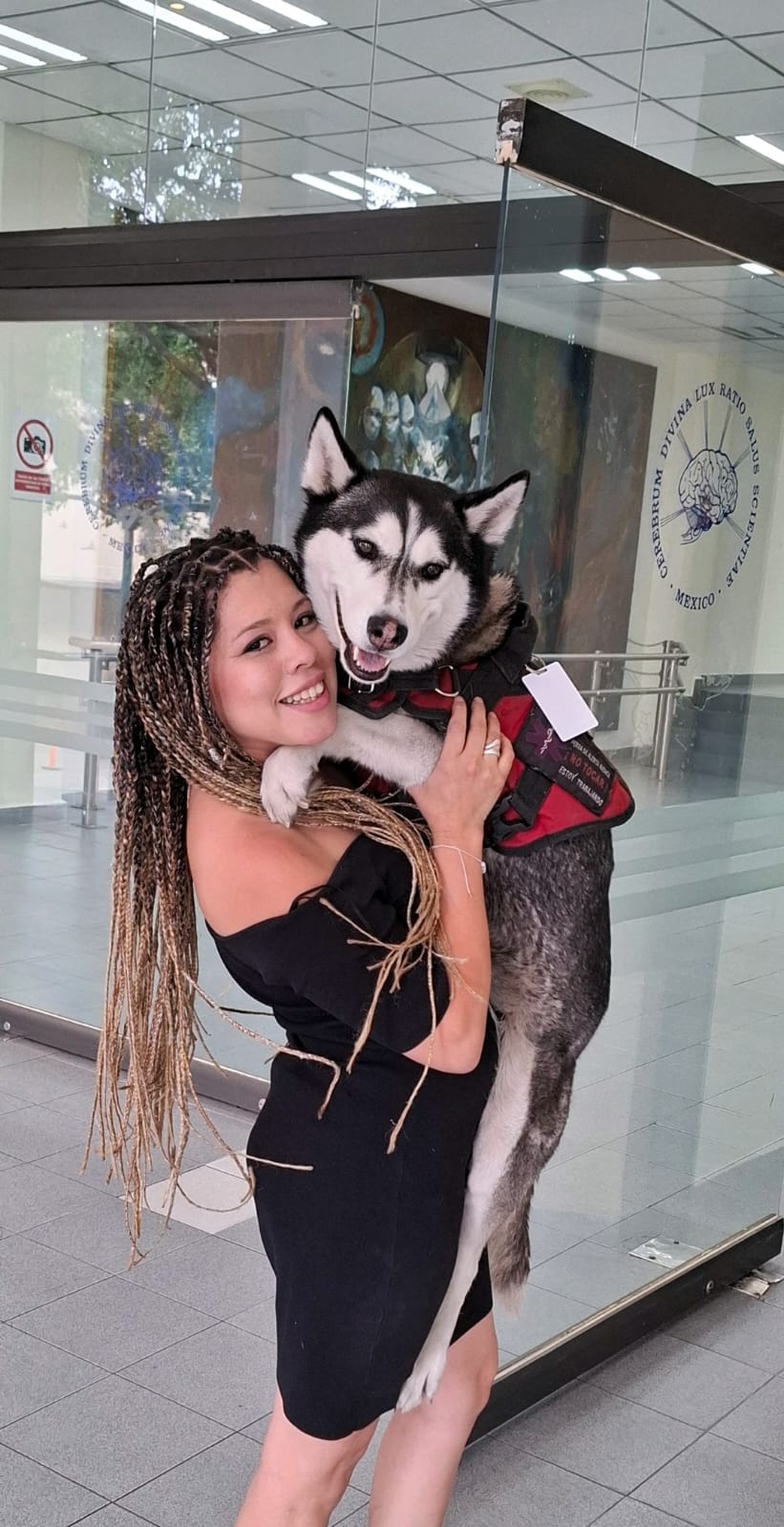 Junto a mí va Mila, mi perra de alerta médica. Es una husky siberiana entrenada para detectar mis crisis antes de que ocurran por medio del olfato.